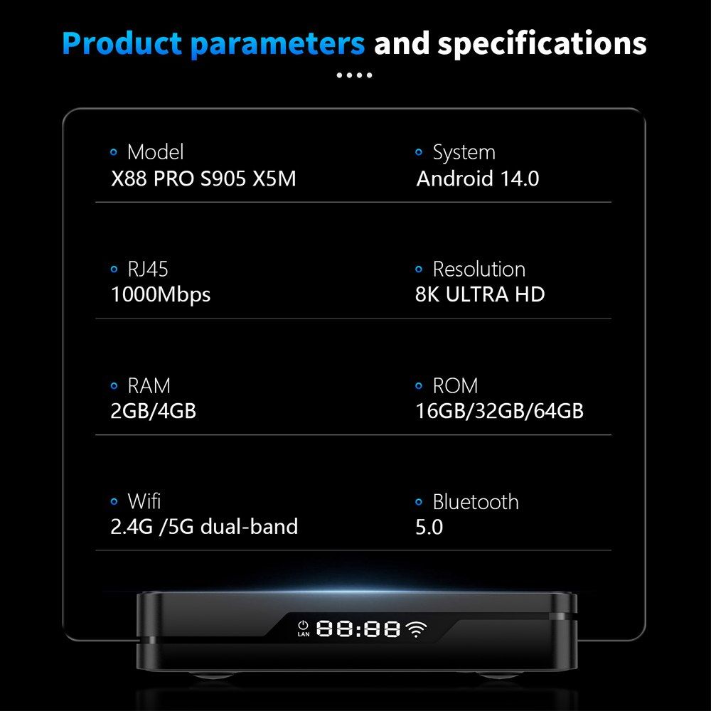 OS: Android 14.0CPU : Amlogic S905X5MGPU:Mali-G310V2Ram:4GB DDR3Rom:64GBLan:10/100/1000BT:5.0Wifi:6Video Format:8K@24fps,4K@60fps,HEVC10-Bit, AV1USB Ports:USB2*2شناسه کالا در انبار: DAB-002